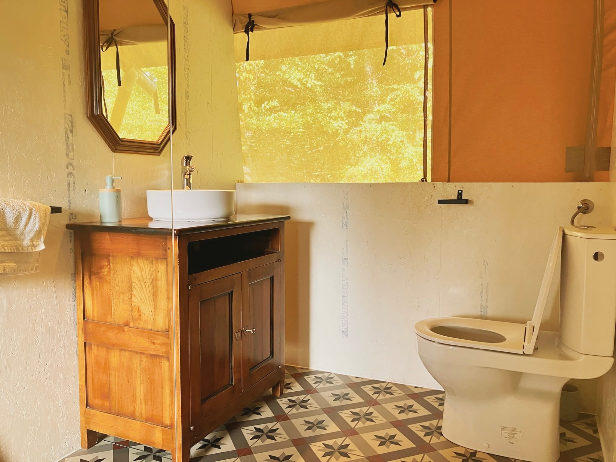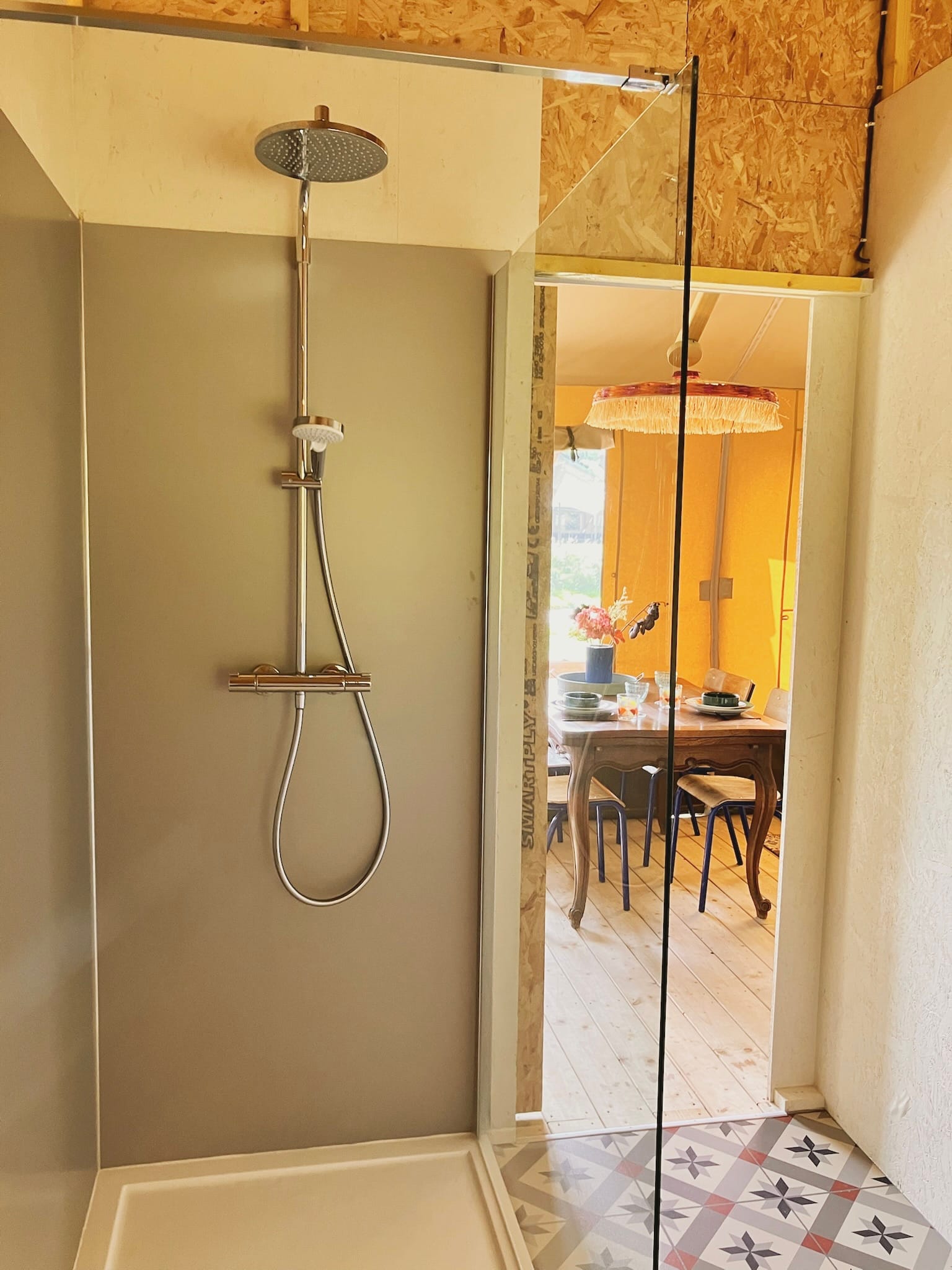 Badkamer in de tent: inloopdouche, toilet en wastafel