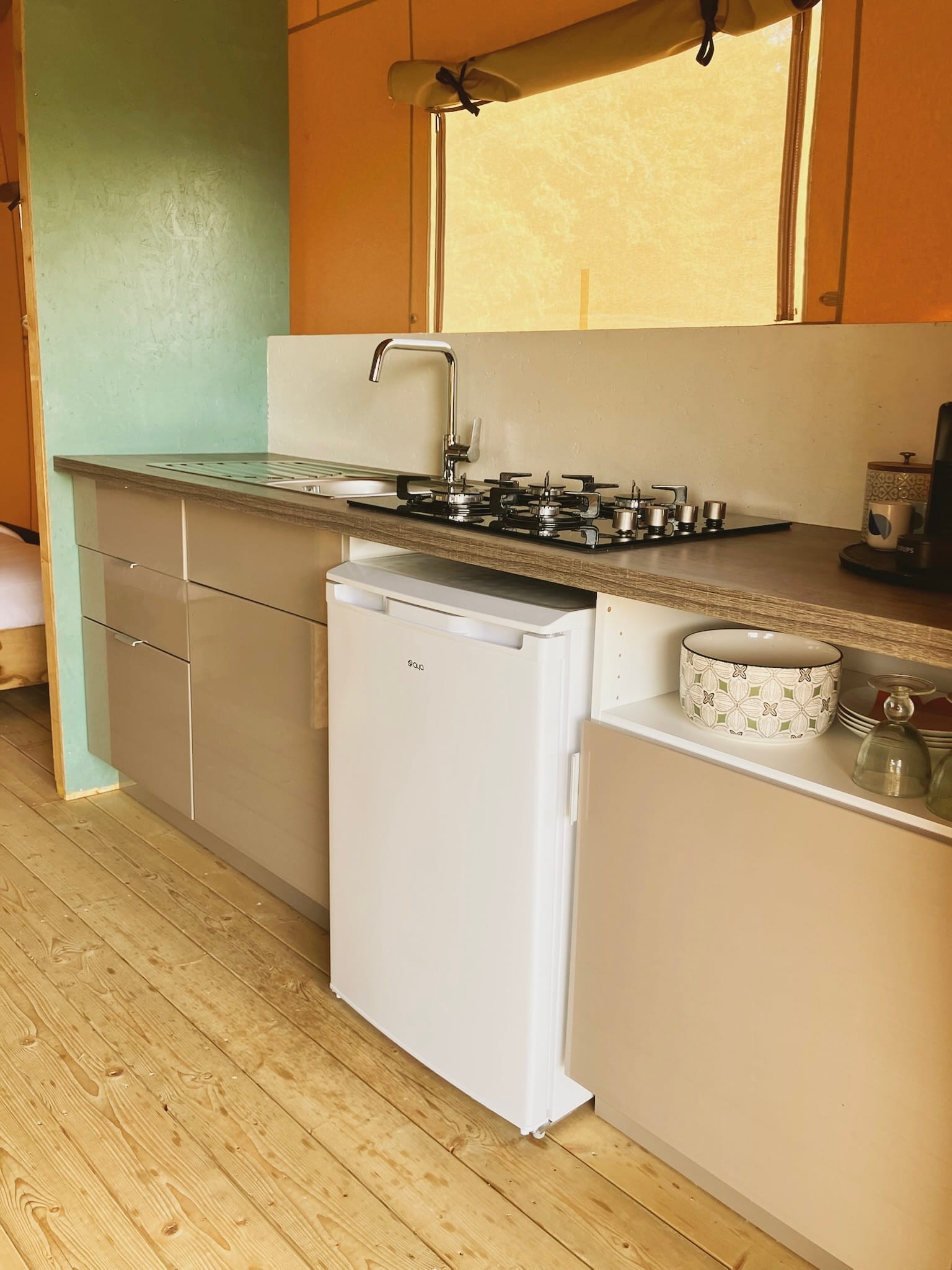 De badkamer in de tent bestaat uit een ruime inloopdouche, toilet en wastafel. Dat is handig met jonge kinderen—je hoeft ’s avonds niet naar een gebouw en alles is dichtbij. Handdoeken zijn inbegrepen.