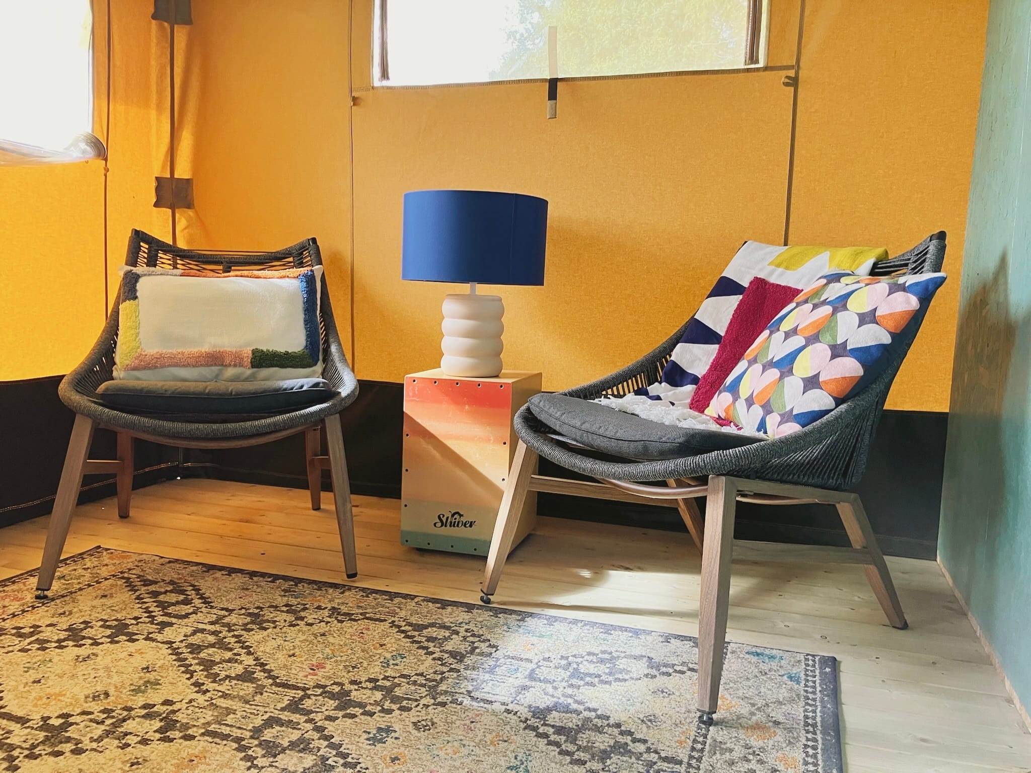 Deze tent is speciaal voor 4 personen. Zo is er een ruime kamer met tweepersoonsbed én een kinderkamer met 2 éénpersoonsbedden. Verder heeft deze tent een ingerichte keuken en eigen sanitair in de tent. Vanaf de veranda is er een prettig overzicht op het grote veld.